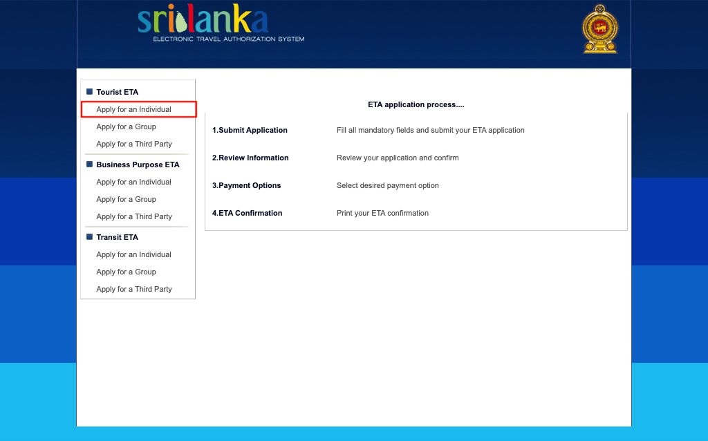 スリランカに観光で訪れる場合、「Apply for an Individual」を選択します。