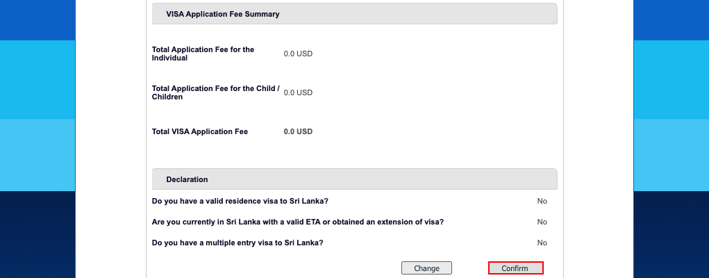 最終確認をして、問題なければ「Confirm」です。間違えた箇所がある場合は「Change」で戻り、修正しましょう。その後も、進めていくと以下のような画面になり、申請完了です。